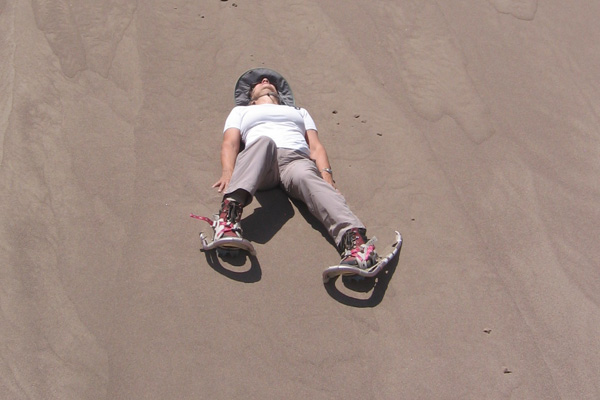 John, Julia and Jillian having watched Shawn’s and my struggles, never even bothered to put on their snowshoes and just resorted to crawling up the dunes on their hands and knees, towing plastic sleds and careening down the dunes until they unceremoniously bale out before hitting the Medano Creek. Shawn and I joined them and had a blast the rest of the afternoon doing the same.