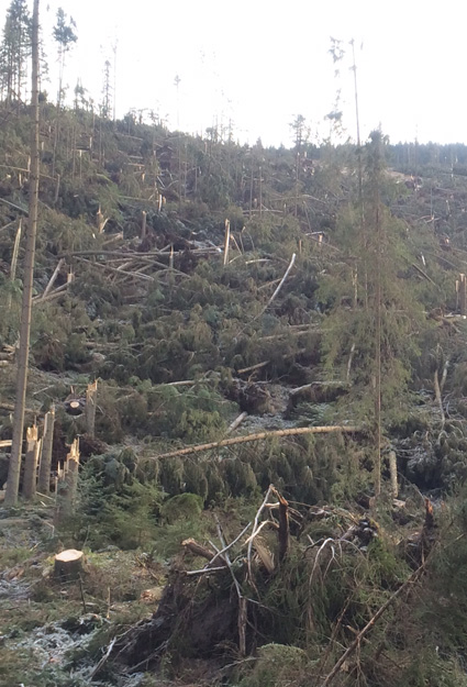 I arrived in Zakopane (elevation 800-1100 meters), my hometown at the foothills of the Tatras, on the 23rd of December. The weather was perfect (!); blue and sunny skies, majestic peaks glistening from a distance. The temperature was just below zero and the snow that has fallen earlier that month persisted. I was excited for a white Christmas at home. Sadly, shortly after my arrival the weather turned bad, really bad. Areas of high pressure from the north collided with a low pressure front over the mountains creating the worst wind storm ever, with wind gusts reaching speeds of over 100 miles an hour (not recorded in this part of Poland since 1968). Not only that this weather change eliminated all the existing snow but unfortunately it led to a substantial damage to the local forests with the estimated loss of several thousand trees.