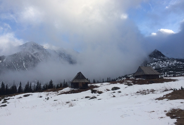 We slowly started our descent following the traverse carved into the side of the Gasienicowa Bowl. The snow was fluffy and there were icy spots here and there. I was very grateful our snowshoes had good crampons. While descending, we reminisced on the years past, our old friends, and the time flew by. We finally reached a group of mountain lakes, typically completely covered by snow this time of the year. Today, one could easily distinguish the perimeters of each lake and a thin ice crust covering them. The high, cascading walls of Orla Perc (Eagle’s Path) above the lakes were gloomily looking at us. There was none else around; one could only hear the wind and crackling of snow under our snowshoes. We were probably another hour from the mountain lodge. We decided to take it easy and instead of following the shorter, yet steeper route, we took a more scenic detour around the lakes; down to the bottom of the valley where the lodge majestically stood among the dwarf mountain pines.