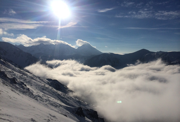 While the trip was being planned in my head, few other events had to occur fist, among them New Year’s Eve party at the Witkacy Theatre. Studying the weather forecast, I realized that the best conditions for our trip might be on the New Year’s Day. Well, it was totally doable, but only if I behaved well the night before and came back home at a reasonable hour. I returned from the party around 3:30am and after sleeping for about 4 and half hours, I felt unusually refreshed and ready to go. At 9:30am on New Year’s Day my kindergarten friend Aldona and I were on the tram taking us above the clouds. It takes about 20 minutes to get to the top of Kasprowy Wierch. When we got there, we were rewarded by the magnificent scenery. Because of the very low cloud cover, many peaks were literally peeking thru the shroud of dense cumuli and the sun was shining at them from the perfectly blue sky above. Life was good! And what a start to the 2014!