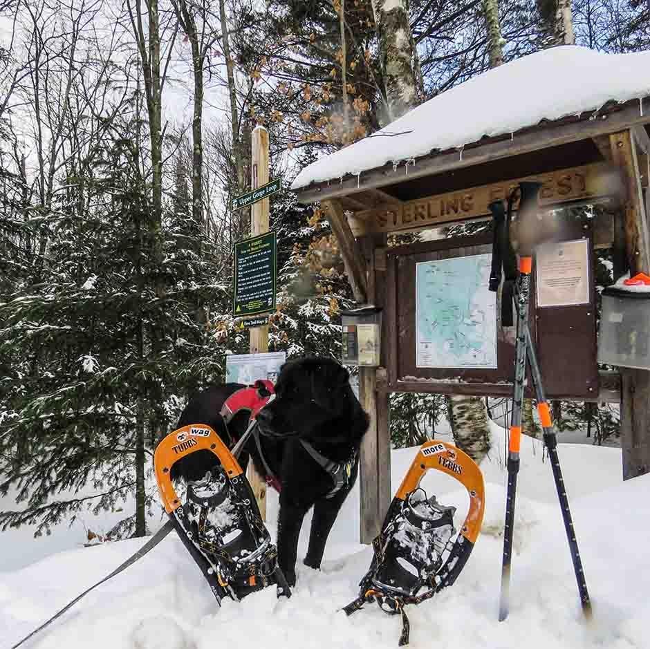 The trail does pass through state, federal, and private land. This includes some cross-country ski areas and resorts, where specific rules may apply. When you enter the trail system of a Nordic center, please check in at the center. Skiing or snowshoeing the Catamount Trail does not exempt you from paying a trail fee (if required) at the center. It is important to note that most touring centers do not allow dogs on their trails; this restricts some of the sections where we can snowshoe, but with nearly 300 miles of trails, we have yet to get bored!